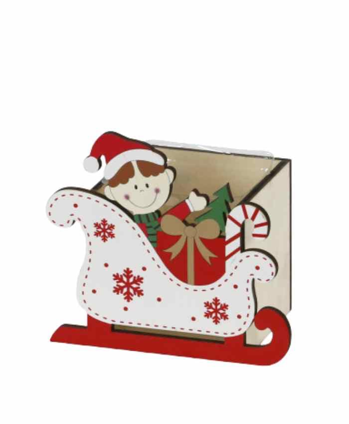 Cesto confezione in legno slitta con elfo bianca cm 14×9 h 13