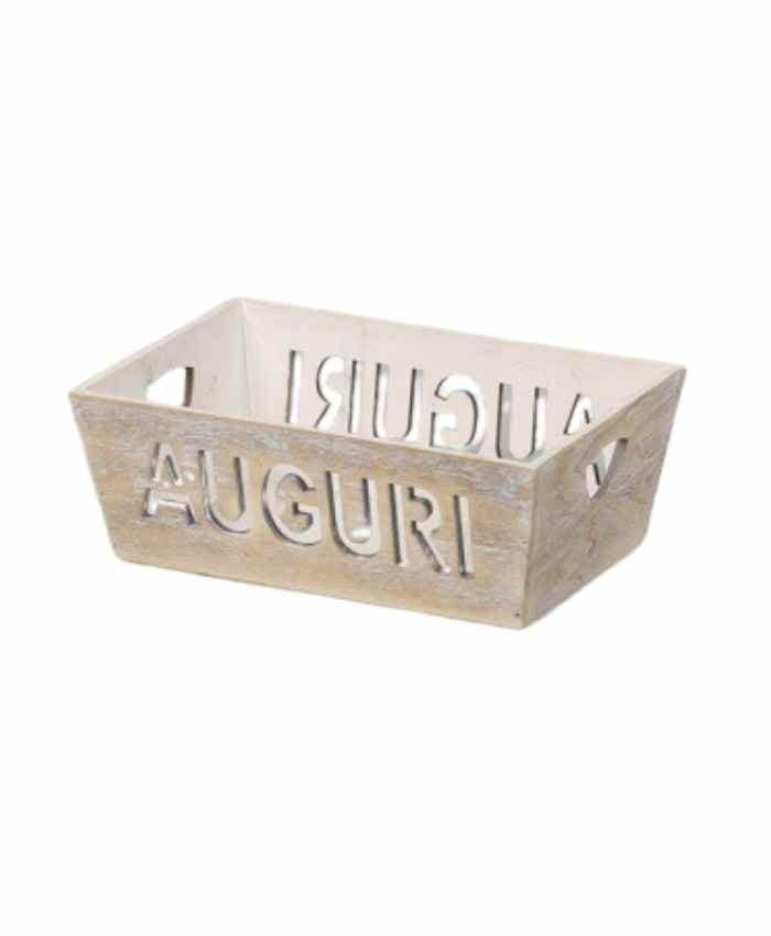 Cesto per Confezioni Vassoio rettangolare legno sbiancato scritta AUGURI cm 30×20 h 11