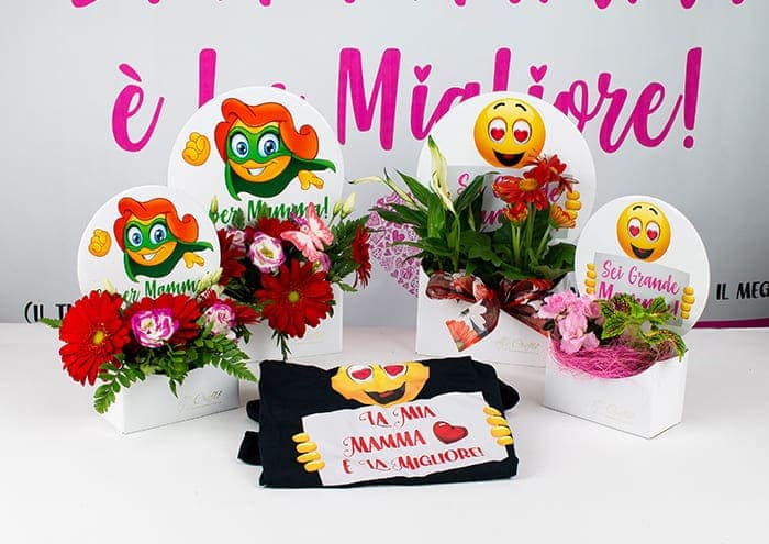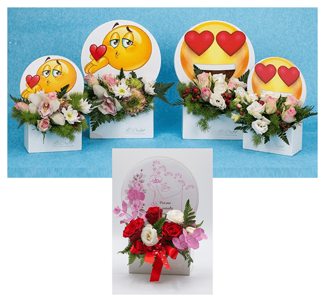 In questo pacchetto sono contenuti 3 modelli di Flower box con emoji, e sticker con frasi romantiche o divertenti