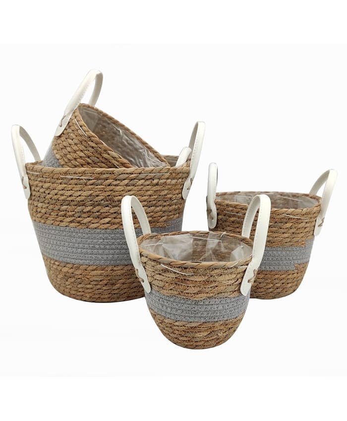Serie 4 cesti tessuto grigio fibre mais manici ecopelle diametro cm 20-22-25-27