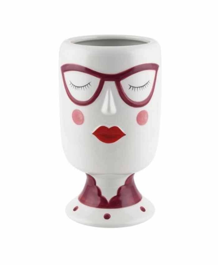 Vaso testa viso donna forma allungata con occhiali bordeaux e gote rosse altezza cm 21